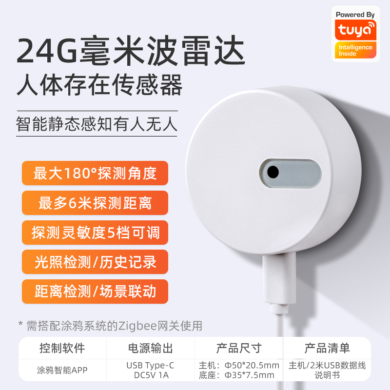 > 涂鸦智能人体存在传感器毫米波雷达24G有人静态移动感应开关侧装