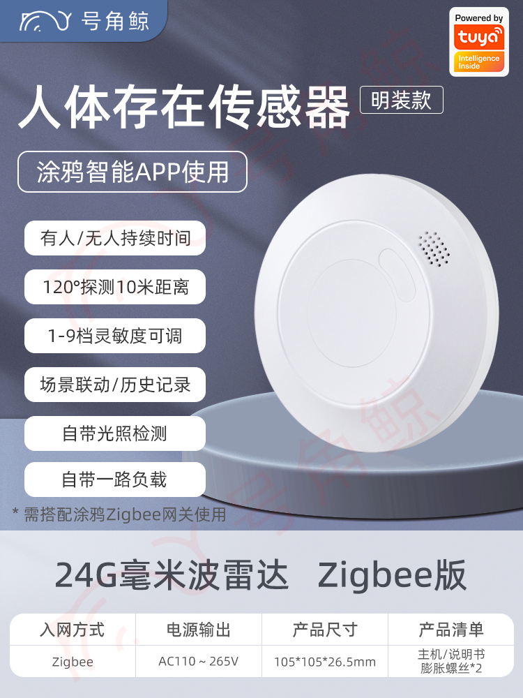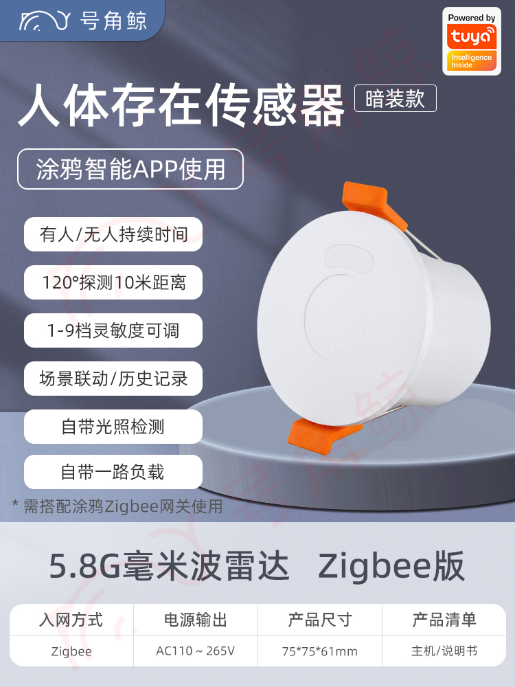 > 涂鸦ZigBee智能毫米波雷达人体存在传感器光照开关灯感应24G顶装